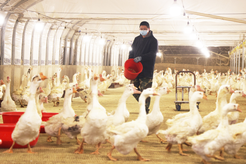在臨海農(nóng)場種鵝養(yǎng)殖基地的鵝棚內,青年養(yǎng)殖人員正專心進行喂食、撿蛋工作。