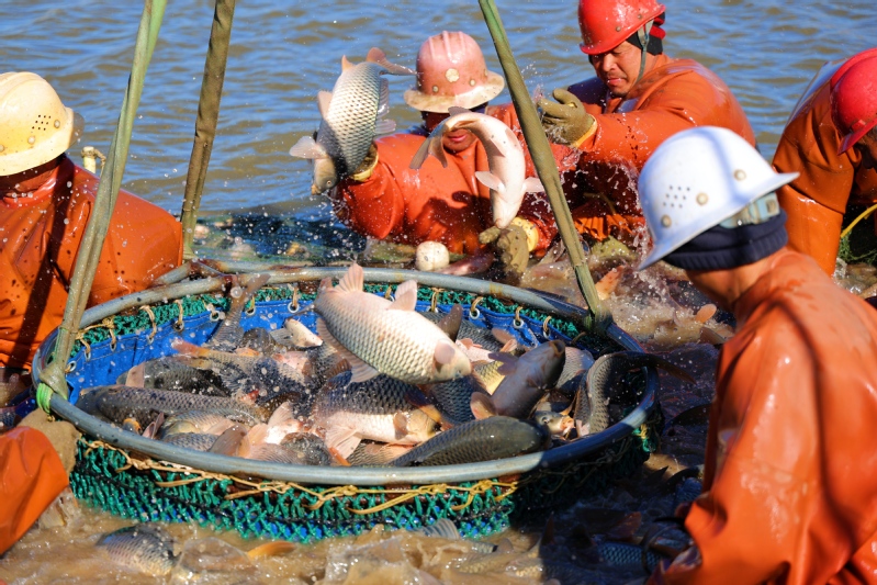 隨著2026年元旦臨近,水產(chǎn)市場需求量逐漸增大,崗埠農(nóng)場積極做好鮮魚捕撈銷售工作,切實滿足節(jié)日市場需求。圖為農(nóng)場加緊拉網(wǎng)捕撈鯉魚、花鰱、白鰱等各種鮮魚,準備供應云南昆明、山東濟寧等多地市場。