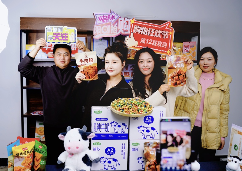 12月12日,蘇墾乳業(yè)巧妙打出“乳制品+肉制零食”營銷組合拳,以A2β-酪蛋白原生高鈣純牛奶搭配新品牛肉粒超值組合為核心產(chǎn)品,實現(xiàn)4小時直播近萬人圍觀、點贊破11萬、銷售額破10萬的亮眼成績。圖為蘇墾乳業(yè)青年直播團隊。